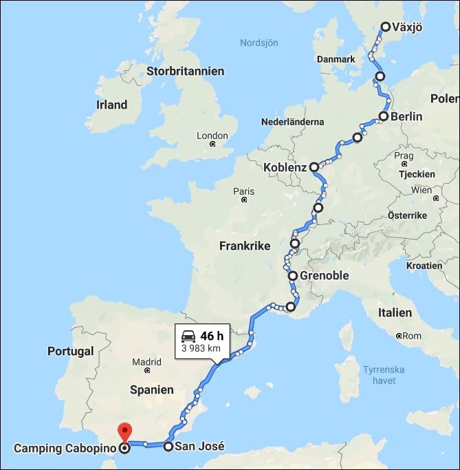 Förra höstens resa följde Västeuropas kust ner till Sagres i sydvästra Portugal. Den här gången åker vi på det andra hållet men delar också upp själva resan i två etapper. Under hösten ska vi ta oss ner till södra Spanien med Camping Cabopino som sista stopp, där har vi bokat plats i 8 dygn. I början av december parkerar vi Piloten vid Malaga Airport och flyger hem för att fira jul och nyår.