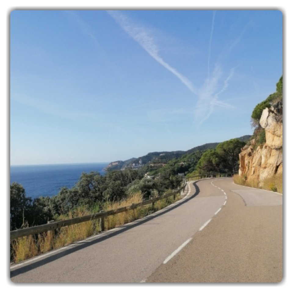På ställplatsen i S`Agaro träffade vi en trevlig svensk man från Norrtälje som tipsade oss om en camping i Mataró ca 35 km norr om Barcelona. För att ta oss dit följde vi kustvägen. Den fantastiska utsikten gjorde att vi fick stanna flera gånger och njuta. Det var en riktig serpentinväg och här kan man verkligen prata om nya äventyr runt varje krök. En höjdpunkt var mötet med ”Wonderman” som just denna dag jobbade i ”trossen” och servade sina cykelkompisar. Han såg till att de fick den vätskeförsörjning de behövde. Gänget var en grupp amerikanska cykelfantaster som tillbringar några veckor här för att cykla.