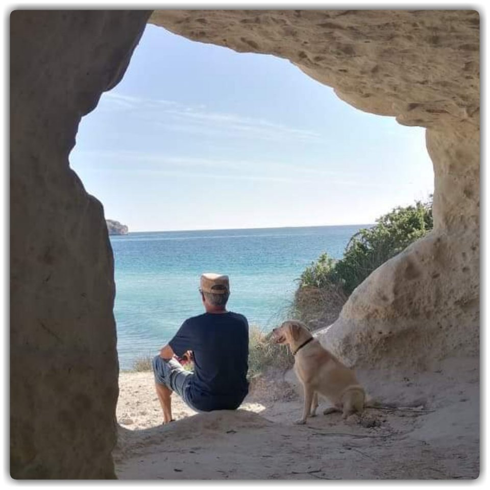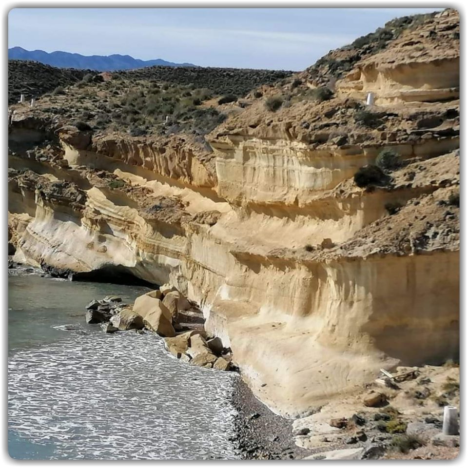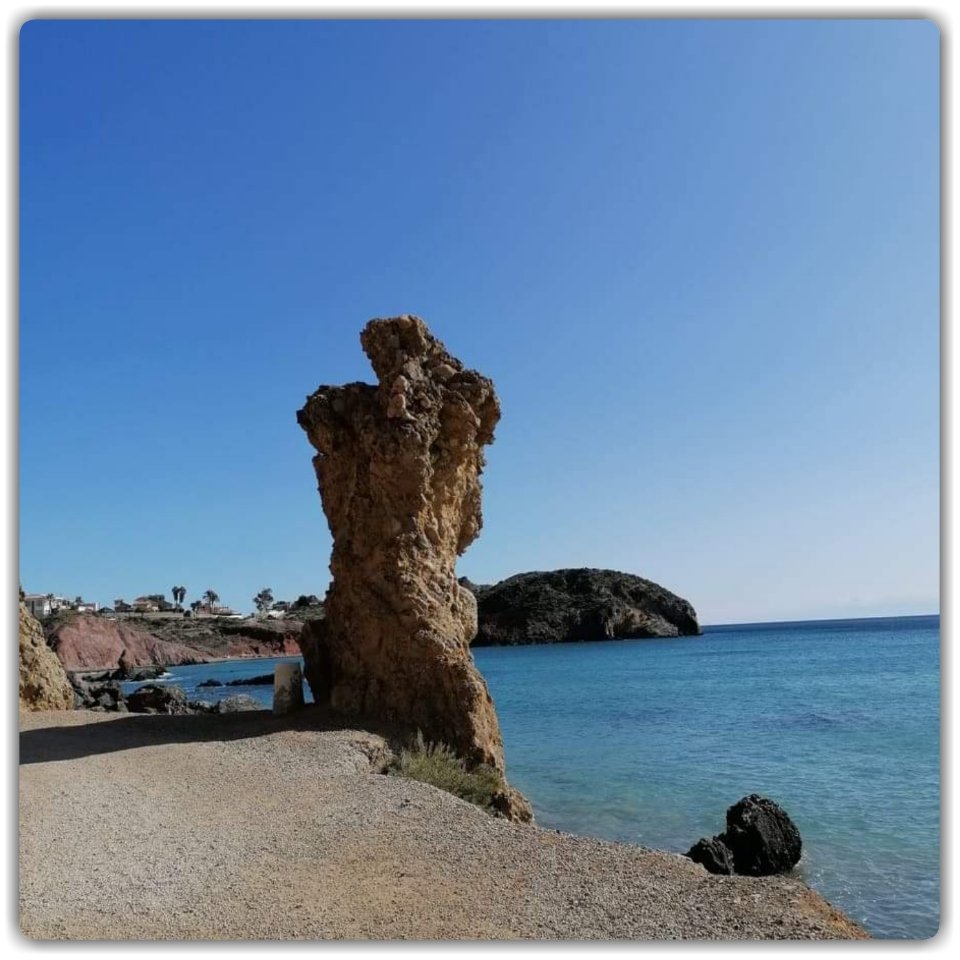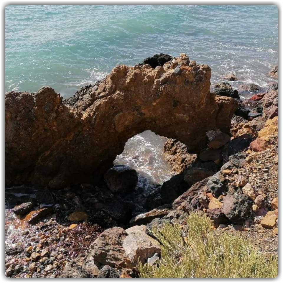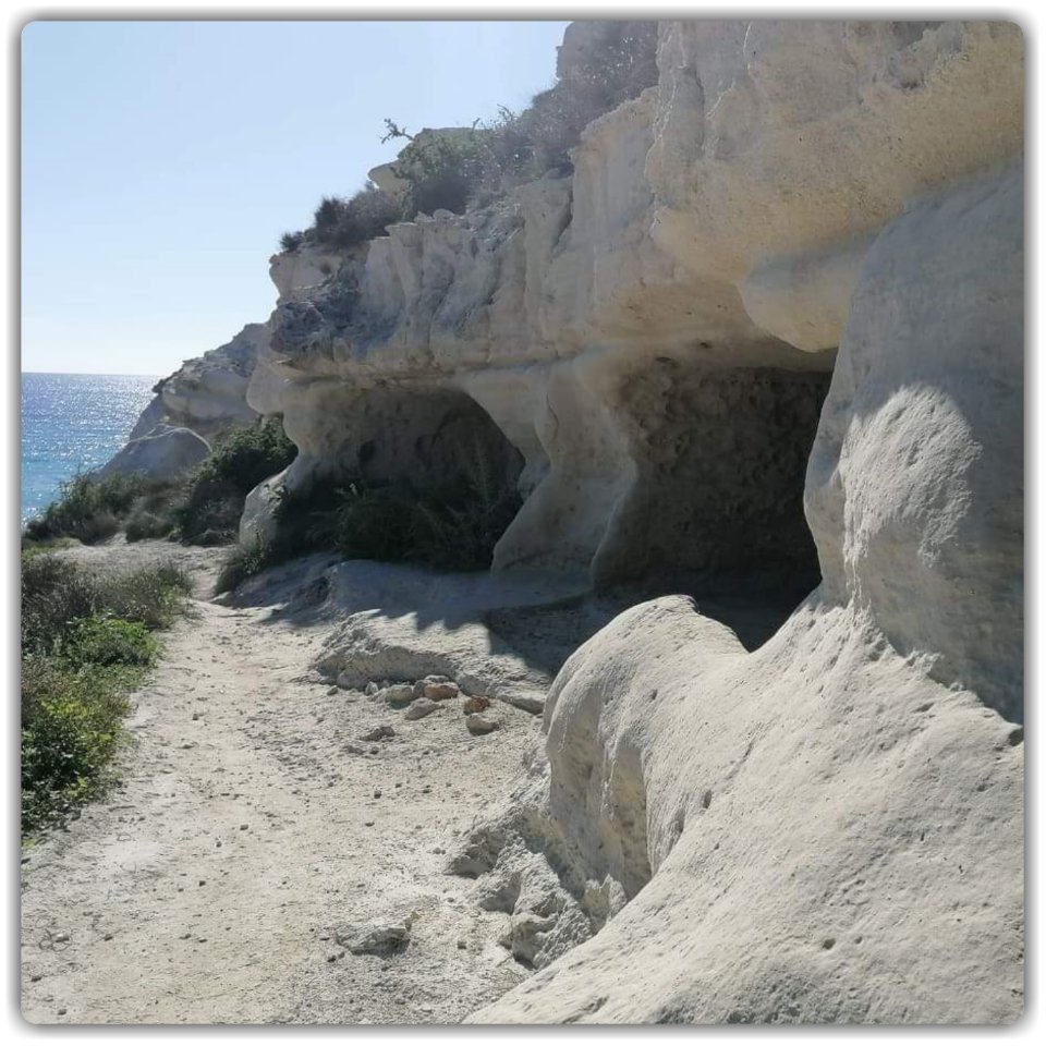 Efter 7 dagar på ett och samma ställe, rekord för oss, packade vi ihop och drog vidare. Vi körde småvägar utmed kusten och hamnade efter ca 18 mil på en ställplats i Agua Marga, (mer info) där vi visste att Nina och Calle fanns. Platsen var verkligen en kontrast till campingen i Bolnuevo. Folktomt i byn och det mesta igenbommat. Men nere på beachen såg vi en rad med klippgrottor som gjorde oss nyfikna. Så vi tog oss upp och undersökte dem närmare. Kanske de hade använts som bostad långt tillbaka i tiden. Osökt kom vi att tänka på familjen Flinta, kanske hade de en semesterlägenhet här!
