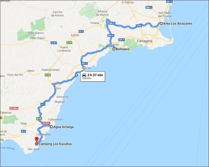 Det märks att hösten börjar närma sig även här. Vi vaknade till en blåsig och mulen dag. Jeansen och tröjan har fått plockas fram för första gången på en månad. Kvällarna är mörkare och kyligare och vi håller oss uppdaterade om de stormar som förväntas komma in. Men en utflykt till San Jose blev av. Byn är den by som ligger så långt sydost som man kan komma på det spanska fastlandet. Vi åkte vidare till ”Vilda Västernbyn” Albaricoques, (mer info) som vi även besökte på vår förra resa. Helt ny ställplats i utkanten av byn, 10 E.