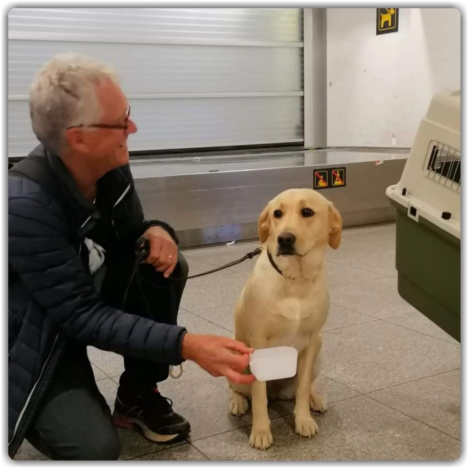 Vårt flyg skulle gå kl 07.00 så vi var på flygplatsen redan 4.45 och trodde att det var gott om tid för att kunna rasta Elsa. Men när vi kom till incheckningen strax kring kl. 5 ville personalen att vi omgående skulle gå till en speciell incheckningsdisk (265) för att där scanna buren och sen sätta in Elsa och säga hej då. Vi ville lämna henne så skonsamt och sent som möjligt! Hon behövde också få en chans till rastning och lätta på blåsan! Men flygpersonalen kom och sa till att vi var tvugna att skynda på så allt gick väldigt fort. När klockan var 5.40 så sa vi hej då till en undrande Elsa, ”vad är det som sker?” Visst kändes det i hjärtat när hon försvann bort på rullbandet.