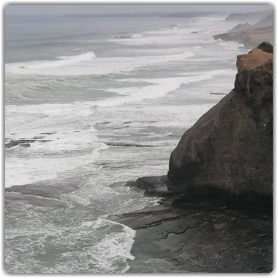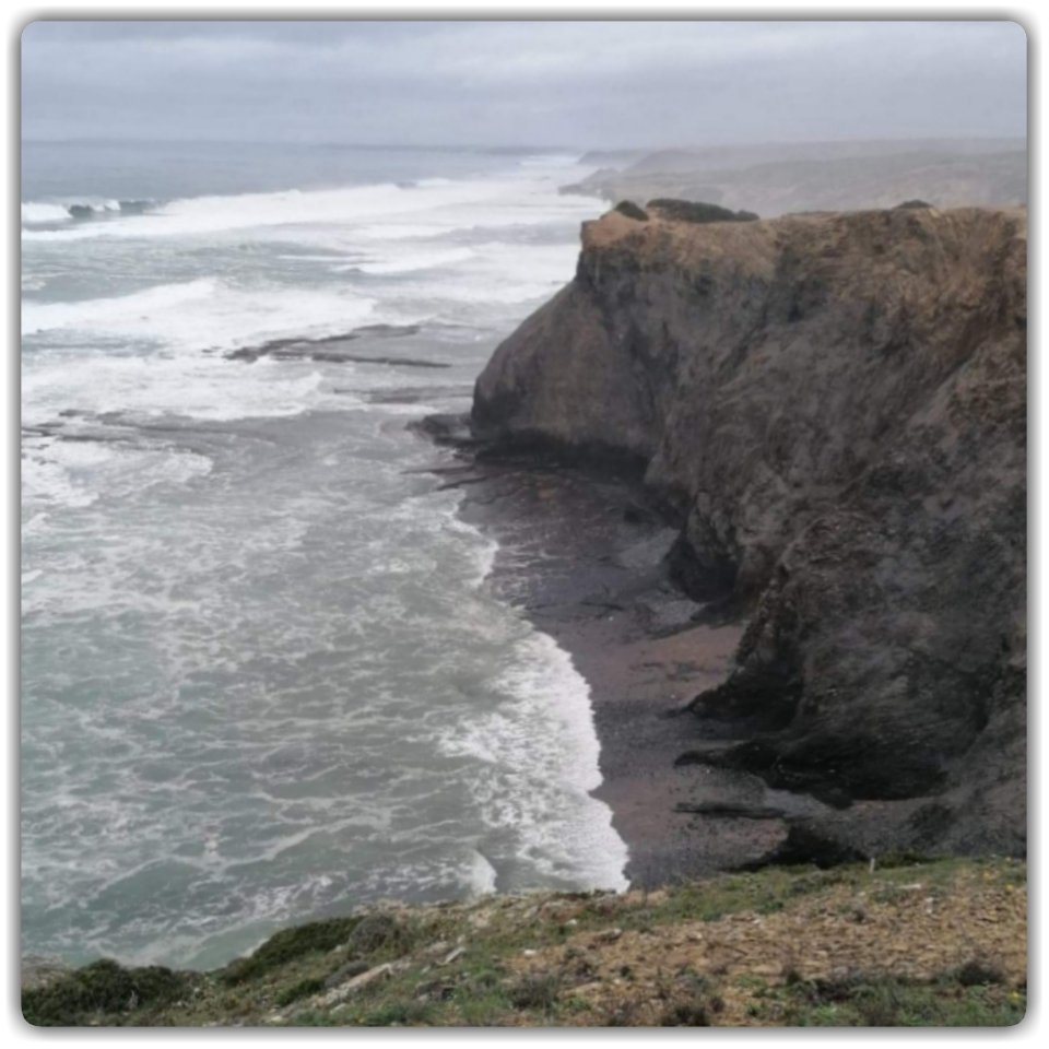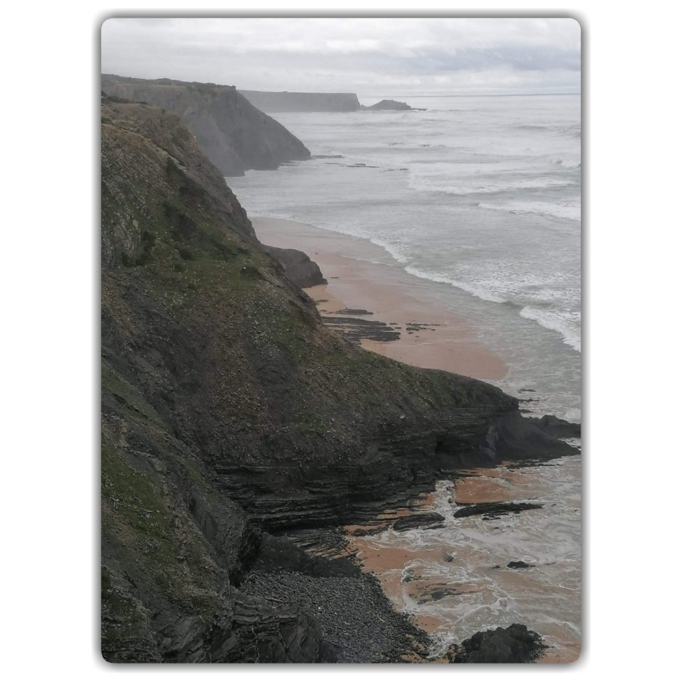 Praia Monte Clérigo tog nästan andan ur oss. Vi mötte samma hav som i Alvor, men i en helt annan skepnad. Kanske påverkade det gråmulna vädret våra intryck.