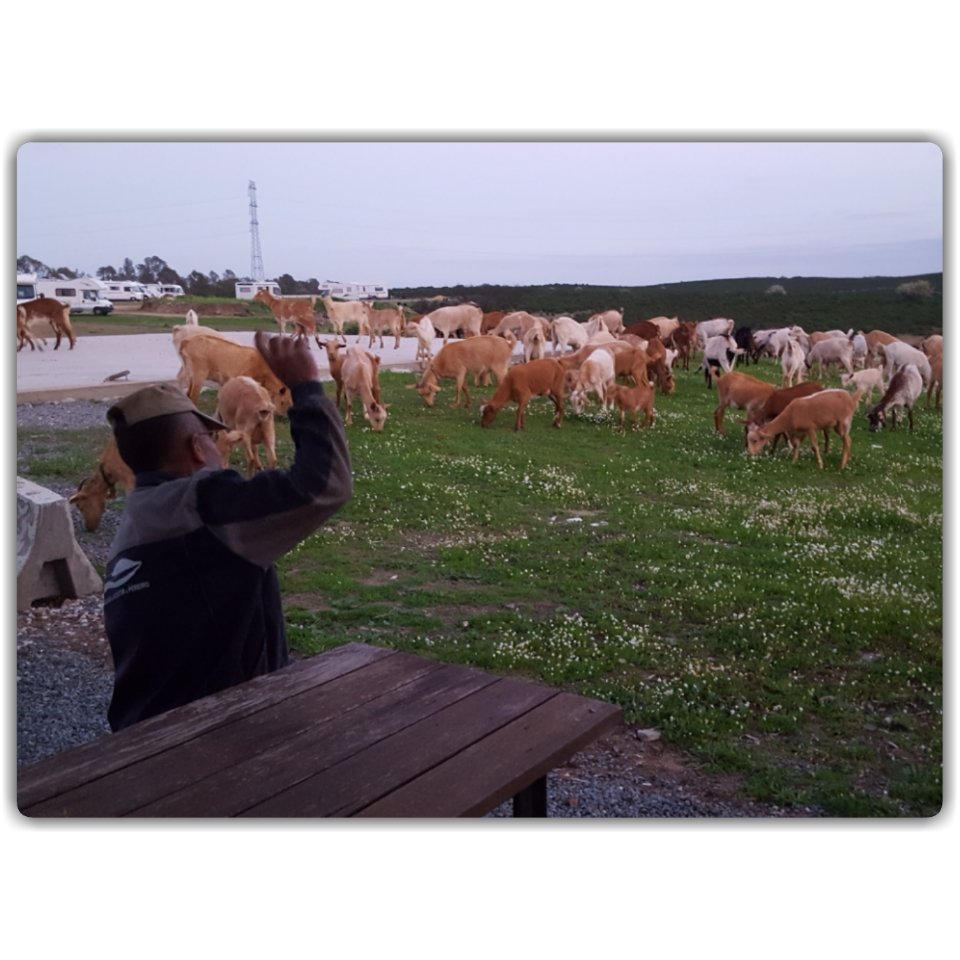 Här finns en ställplats strax utanför byn, (mer info). Stor och öppen med en liten damm bredvid. Väldigt vackert! Helt gratis med wc och tömning. Vatten kan köpas men med kanna så finns det ändå. Även här råder landet, vår middag avbröts när herden kom med sin flock getter och passerade rakt igenom parkeringen.