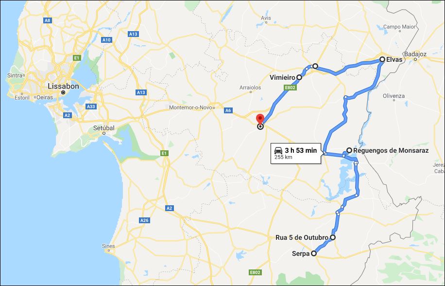 Vår resväg de senaste dagarna, från Serpa hit till Évora.