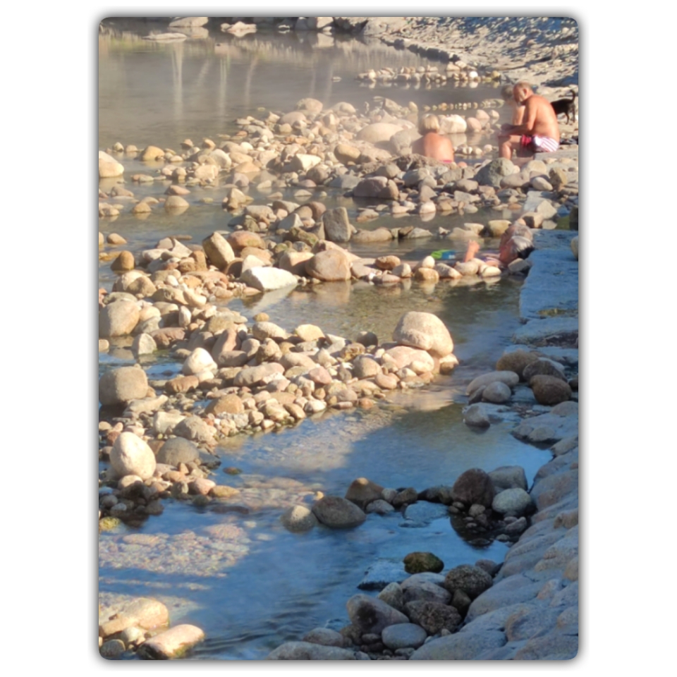 Där ute porlade kallt och friskt vatten men i de små ”bassängerna” var vattnet minst 45 grader. Ju närmare utloppet av det heta underjordiska vattnet, desto varmare. Varför det var så lite vatten i själva floden fick vi ingen förklaring till, kanske beror det på årstiden. Förra gången var det mycket mer.