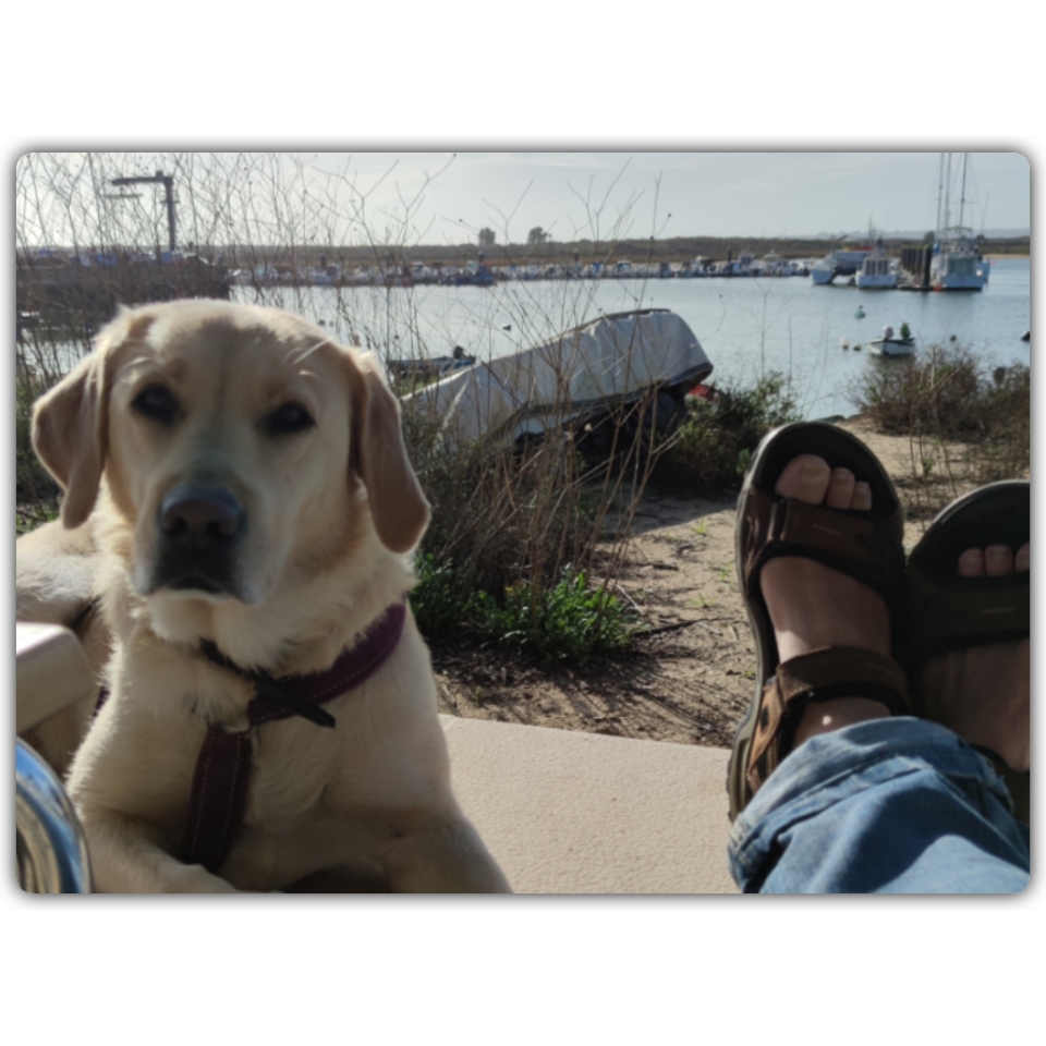 Det fick bli en promenad ner till hamnen för en liten lunch. Lite annan väderlek än hemma. Även Elsa kunde slappa i solskenet!