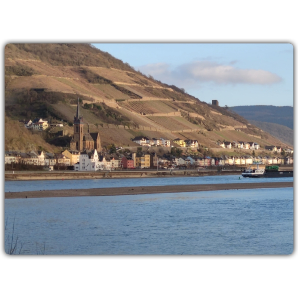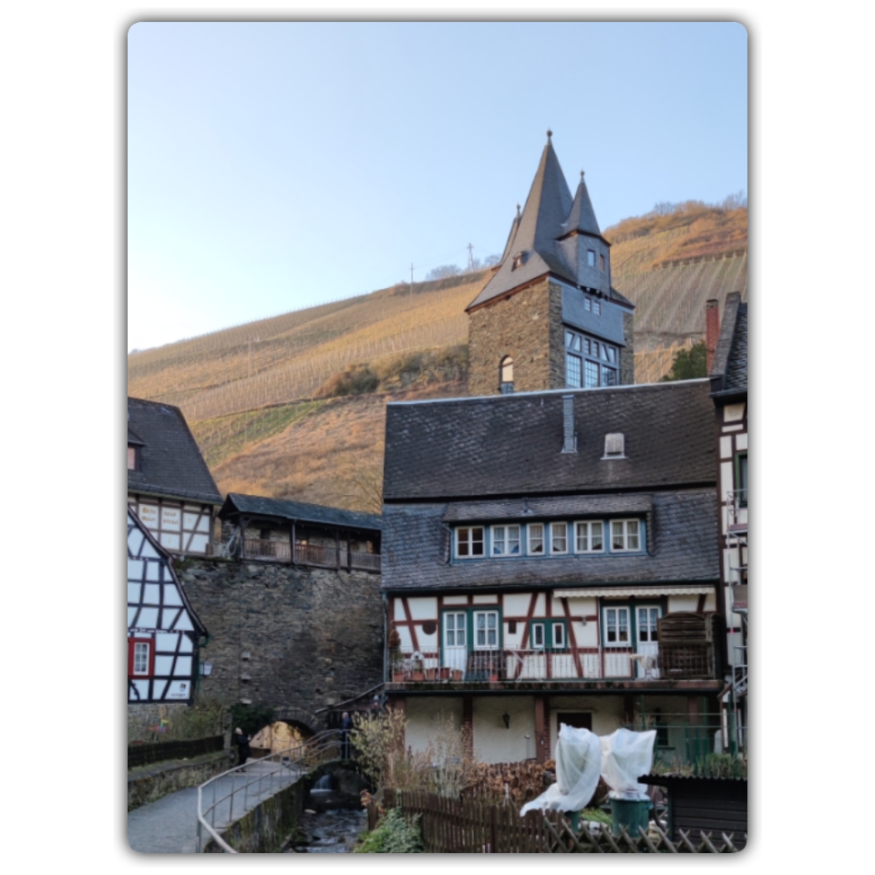 Efter ytterligare ca 30 mil är vi nu i Tyskland. För enkelhetens skull har vi stannat i Bacharach, som ligger utmed floden Rhen. Vi har nämligen varit här tidigare. Ute på floden brummar pråmar i strid ström men uppe i själva byn lägrar sig lugnet.