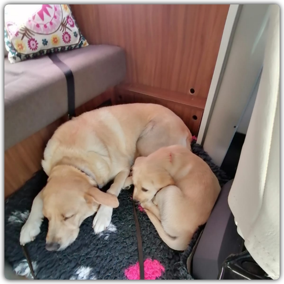 Hur gick det då med Doriz i husbilen. Jodå, det kommer att gå bra. Hon hittade snabbt en bra plats att sova på under färden dit och hem, inga ”olyckor” skedde och hon förstod snabbt att en fördragen myggdörr betyder ”stopp, stanna inne”.