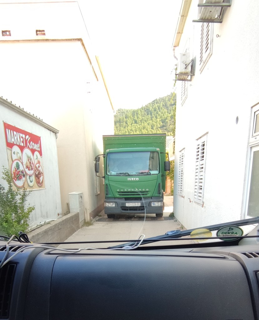 På väg från campingen skulle vi igenom byn igen. Det gick bra från början även om det var smalt.