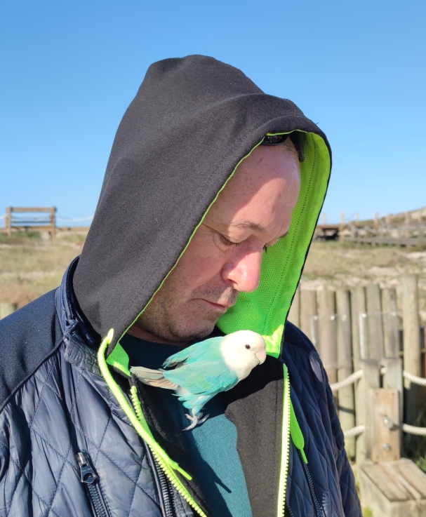 Vi stannade för övernattning i Costa de Lavos, fiskarnas by. Här mötte vi i undulaten Maggi som var ute på kvällspromenad med sin herre.