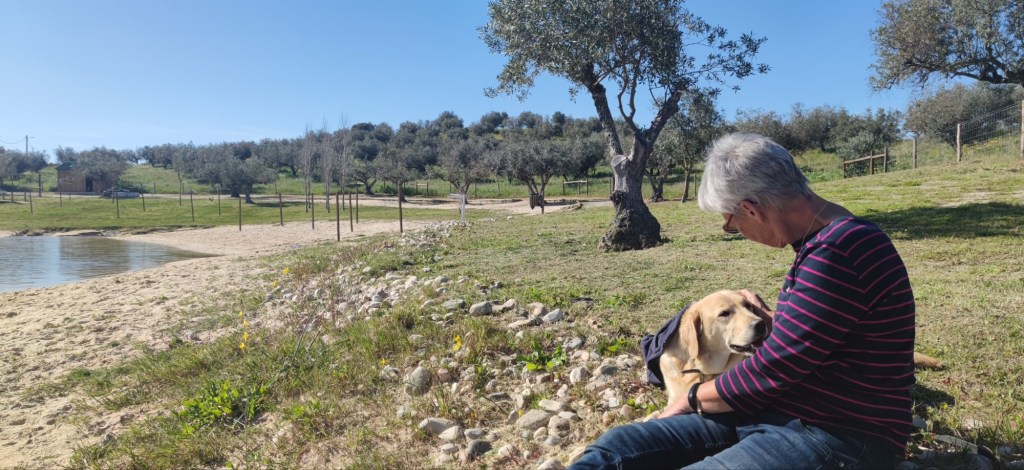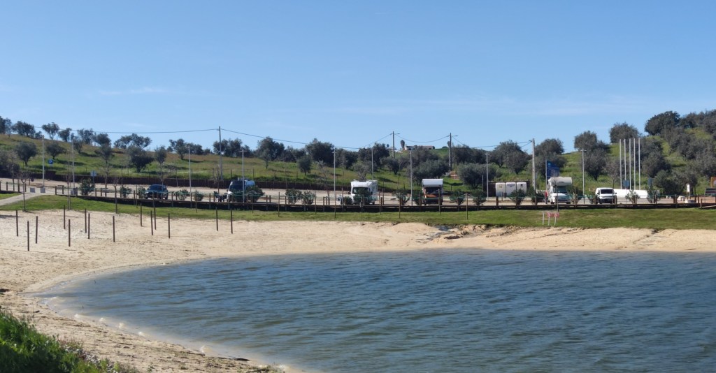 Men tack vare detta oplanerade stopp, fann vi en fantastisk plats, Alqueva, bara två mil norr om Moura. En anlagd sandstrand och en liten marina inom samma vattensystem som man ser ifrån fästningen Monsaraz uppe i norra delen. Här finns parkering för husbilar och uppe i byn ska det finnas tömning och fyllning. Här fick Doriz verkligen springa av sig och ge utlopp för sin energi. Ett litet dopp blev det också.