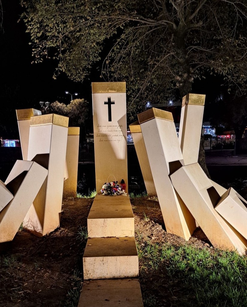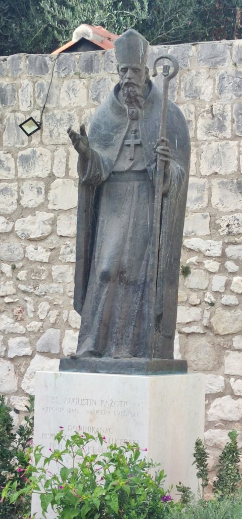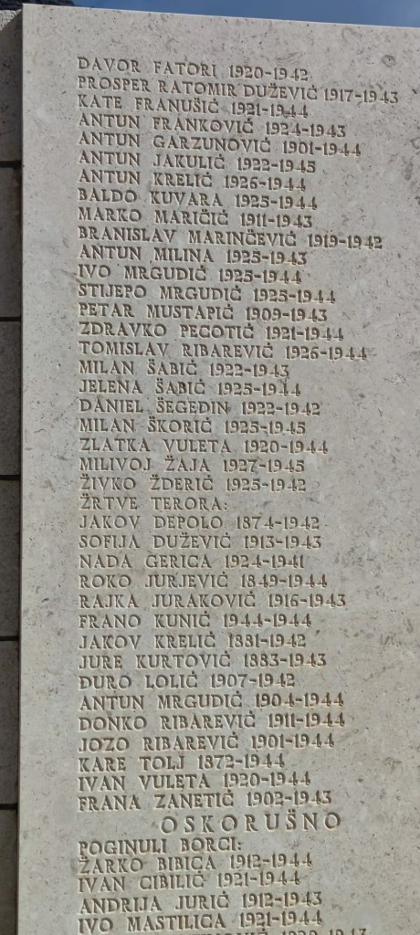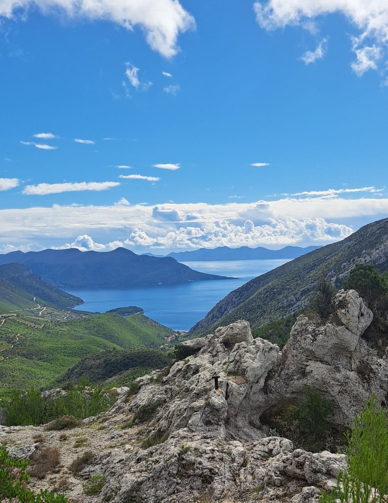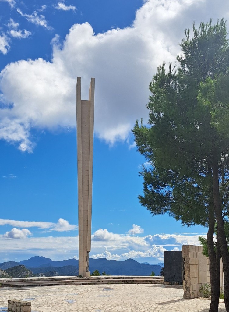 Vägen genom hela Pelješac-halvön är vacker och på sina ställen slingrande. Det går upp och det går ner, på flera sträckor är det max 30 som hastighet. Gäller att hålla hastigheten, inte för fort men inte heller för sakta:-). Vi stannade vid ett högt monument med en storslagen utsikt över dalen och havet nedanför.