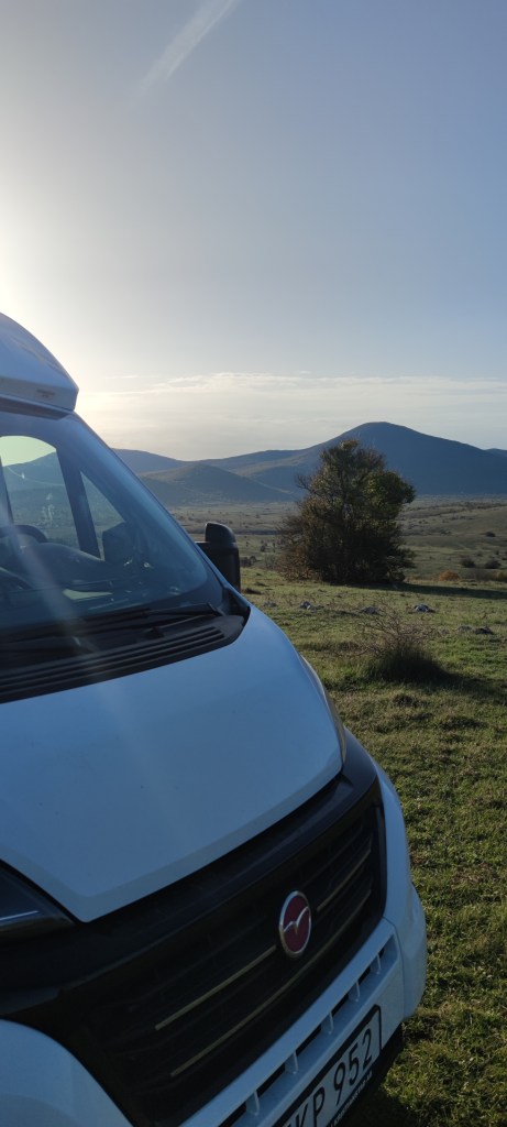 En parkering utmed väg D522 på vägen upp mot Nationalparken Plitvicka Jezera. En platå med storslagen utsikt. Vi körde några hundra meter från vägen så ingen kunde se oss från vägen. Naturligtvis ingen service men mycket vackert. Hittade parkeringen via Park4Night.