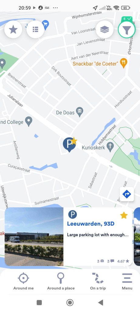 Stor parkering utanför Friesland Collage. Även om den var stor fylldes parkeringen på under morgonen. Vi flyttade oss lite så vi inte skulle bli ”instängda”. Men vi sov gott och hundarna kunde springa av sig under kvällen