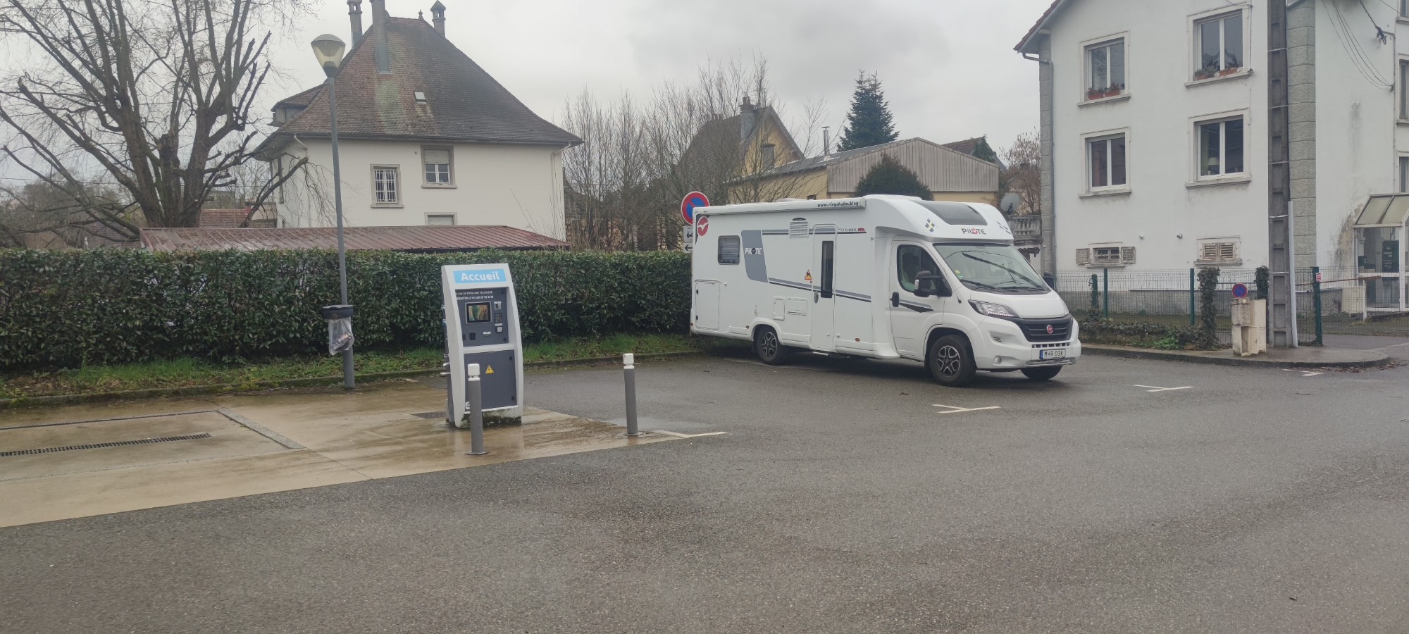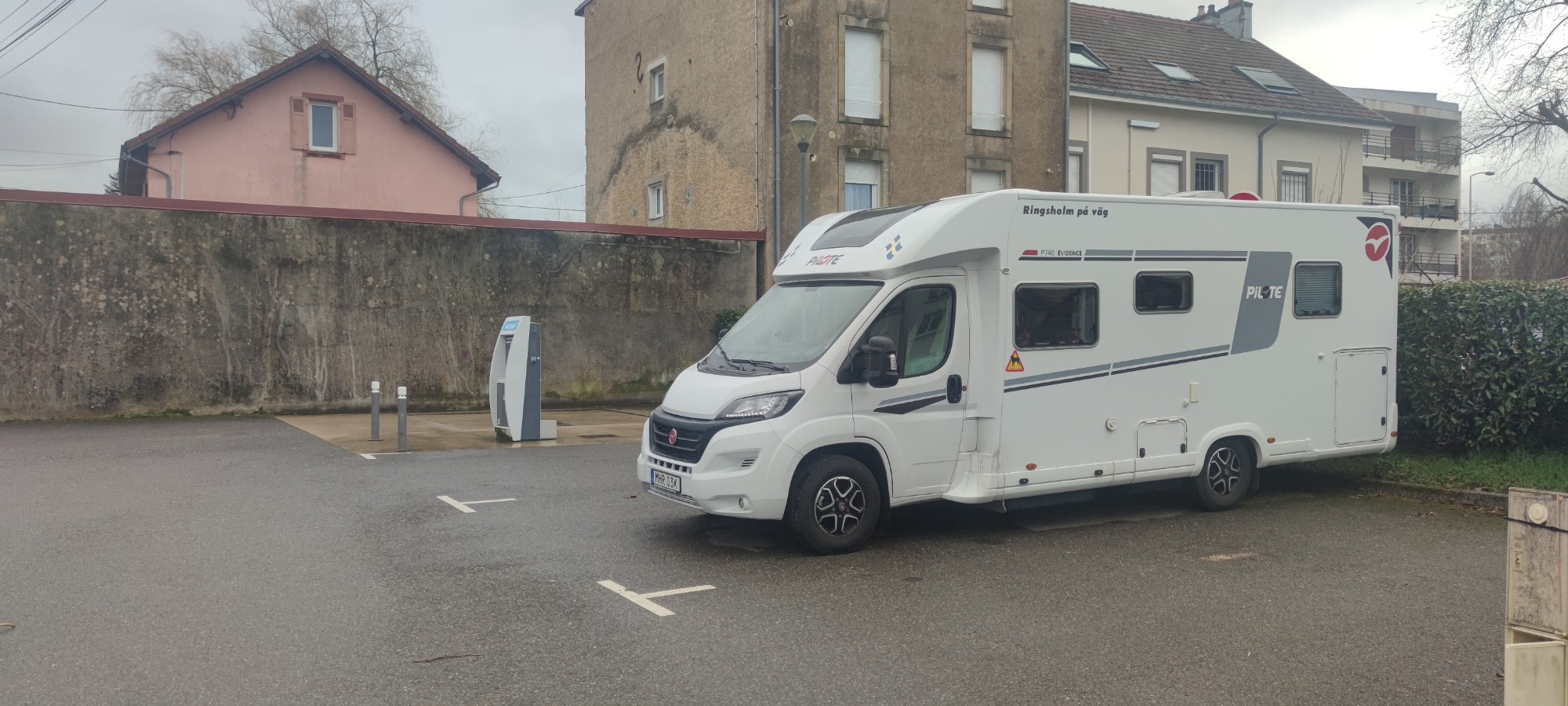Liten gratis ställplats för tre husbilar vid en idrottsanläggning. Tömning och rent vatten, el mot avgift. Helt ok ställe att stå på. Några hundra meter härifrån finns en ordnad ställplats, avgift.
